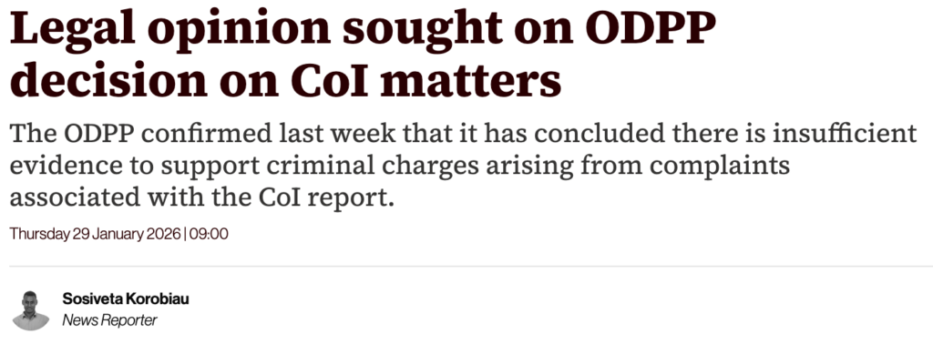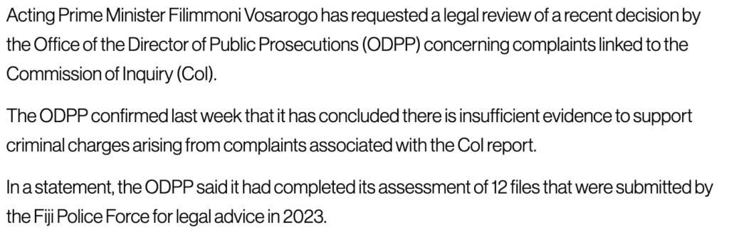 Now the Fiji Sun story on Filimoni Vosarogo calling for details of the decision by the ODPP not to prosecute any of the 12 police cases arising from the CoI.