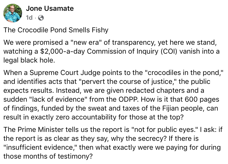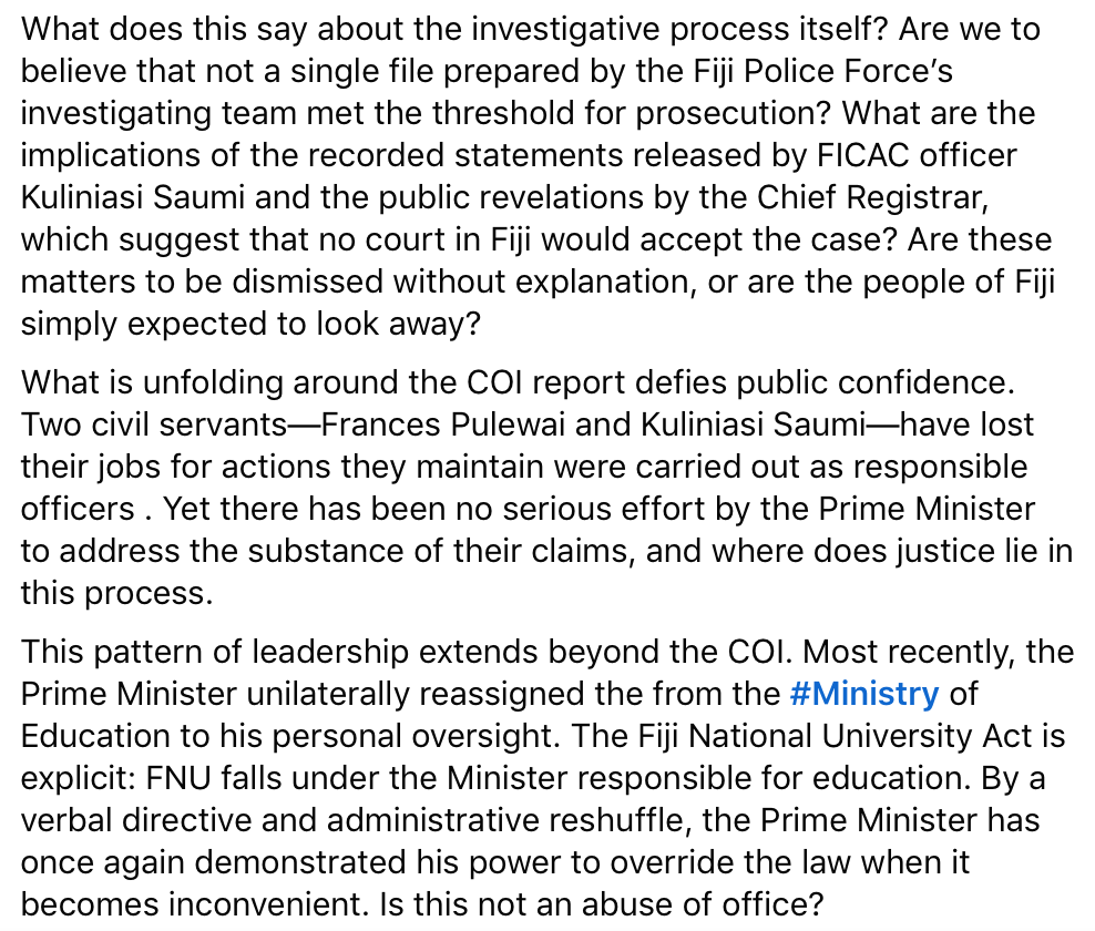 Well now they have – certainly judging from the latest Facebook statements from Inia Seruiratu and his colleagues in People First, Premila Kumar and Jone Usamate. (see below) The remnants of the Frank Bainimarama era seem to have finally found their voice. And found an issue on which they will be able to run and run all the way to election day unless Sitiveni Rabuka grasps the danger he is now in for having failed to confront Salesi Temo and suspend him for misbehaviour when the COI first reported.