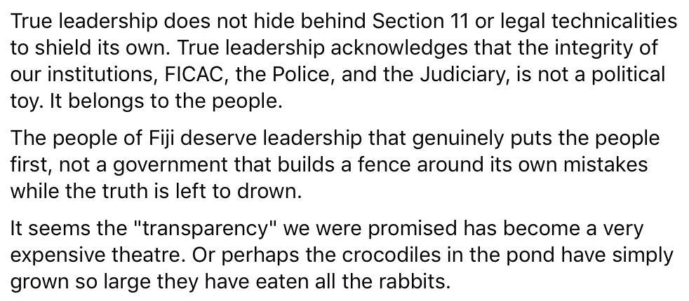 Fa is the same lawyer who stitched up Shailendra Gopal Raju in the YP Reddy’s ( Tanoa Group) deceased brother and sister inlaw case – it’s in the public domain how he went rogue against his own client and Shalen Raju over his expected payment – Poor Shalen Raju spent years fighting the Reddy case, went to his trusted mate Fa who stitched the client and Raju both for $ – note that Shalen Raju now doesn’t post FB pictures of him and Fa having coffee and food anymore – FA is no different to Rabuka, he is also a snake but different breed – Davis is 100% correct, they all will be judged when govt changes, nothing lasts forever, ask Bainimarama and Khaiyum.