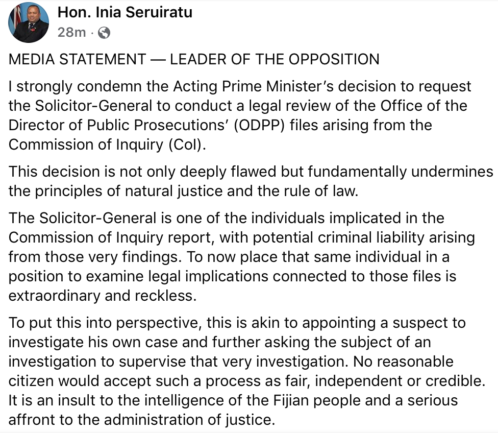 First a hard-hitting statement from the Opposition Leader, Inia Seruiratu.