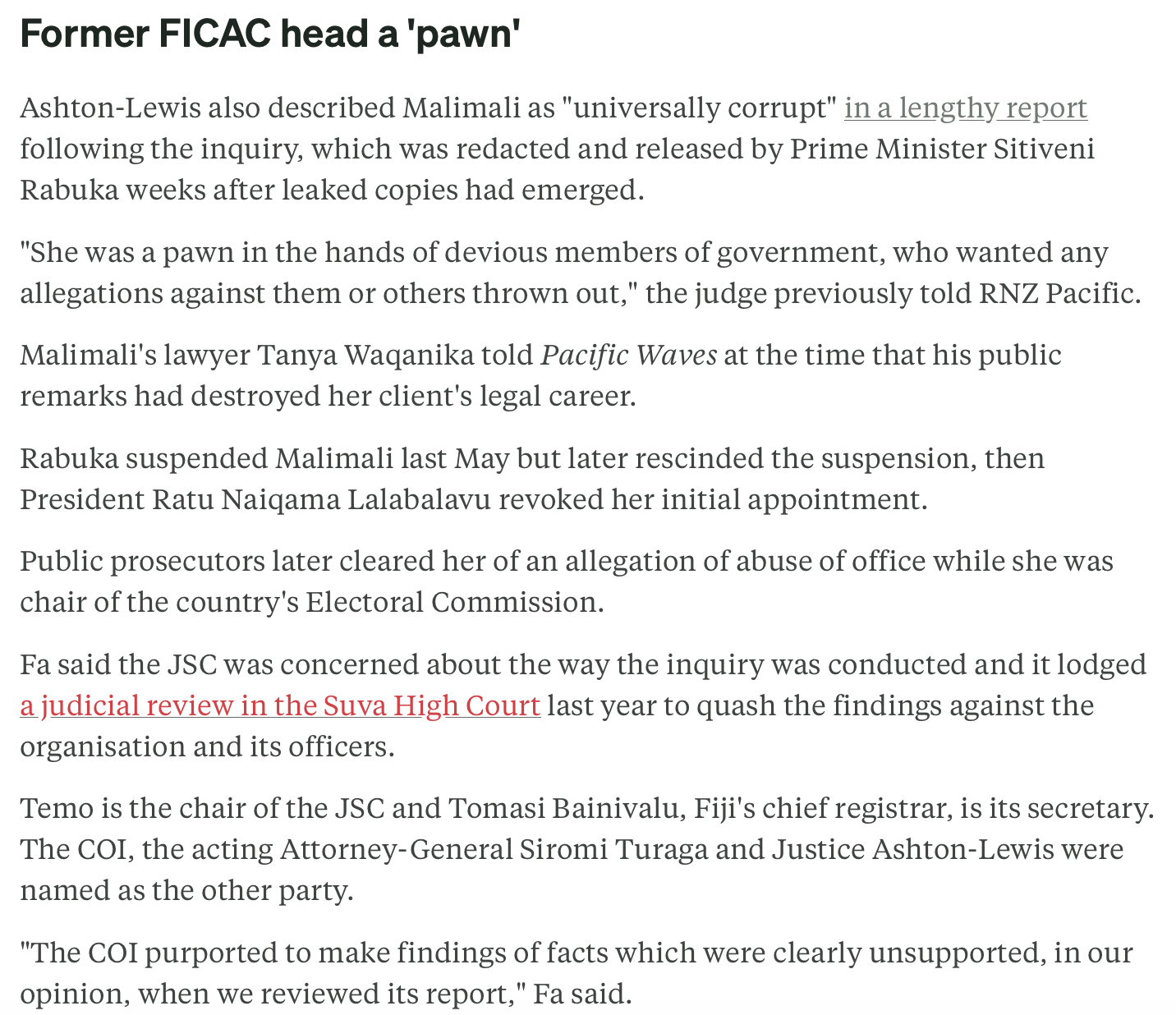 2/ At the same time as the RNZ interview has appeared, Rabuka’s lieutenant, Filimoni Vosarogo, is asking for the details of the decision by the Acting DPP, Nancy Tikoisuva, not to prosecute any of the 12 cases arising from the COI that were investigated by the police. Why is Vosarogo asking for this? He has nothing to do with the criminal justice system, having been prevented from becoming Attorney General because he was three times found guilty of professional misconduct by the Independent Legal Services Commission.