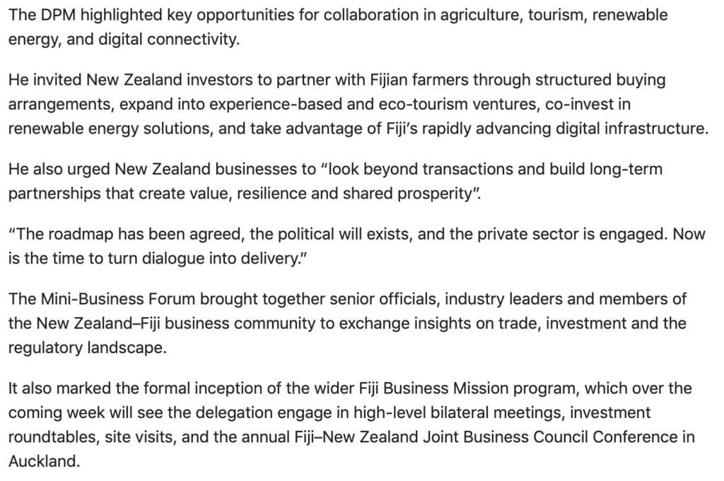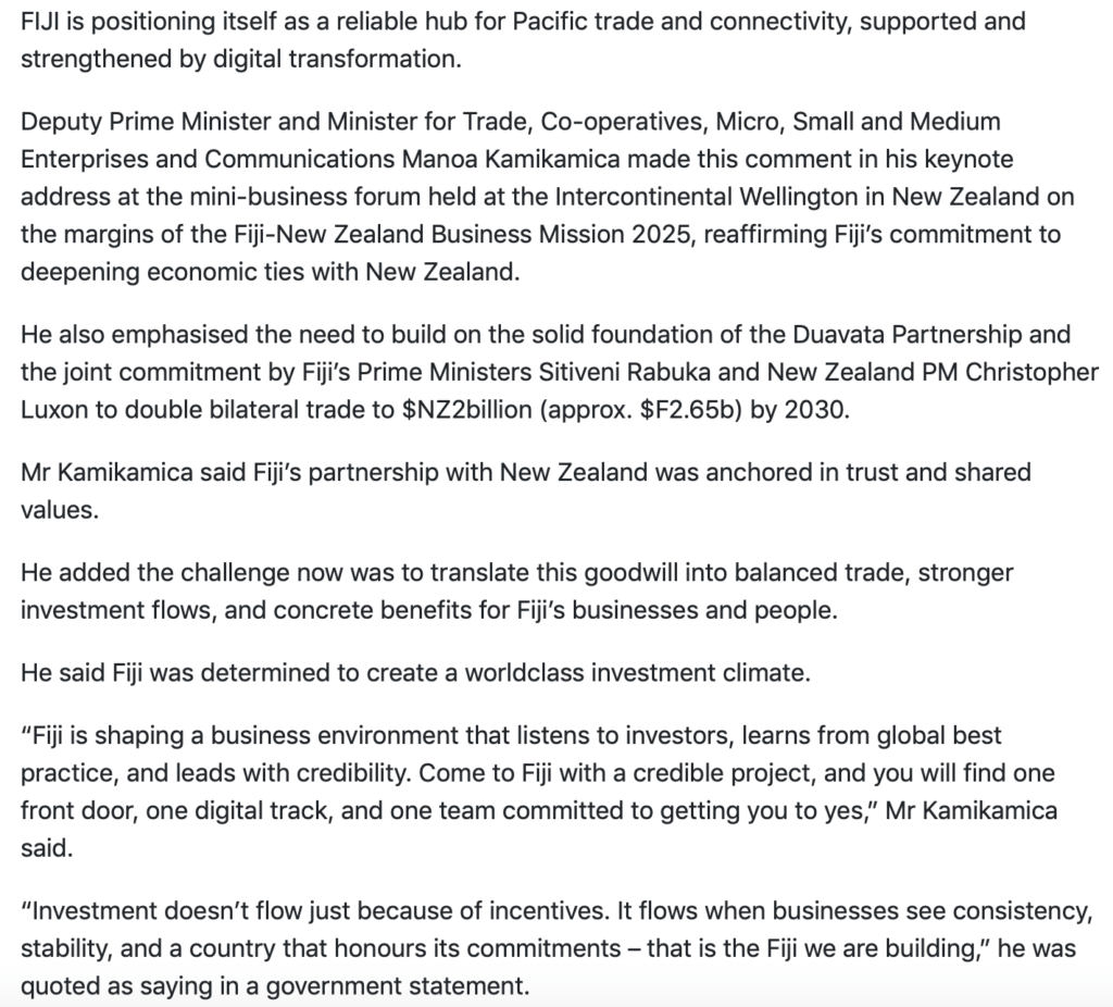 The message from the Coalition is precisely the same highfalutin message Grubsheet used to write at the behest of the last government. In fact, some of the words in this speech could have been lifted straight from Aiyaz Sayed-Khaiyum‘s playbook for his own trade minister, Faiyaz Koya.