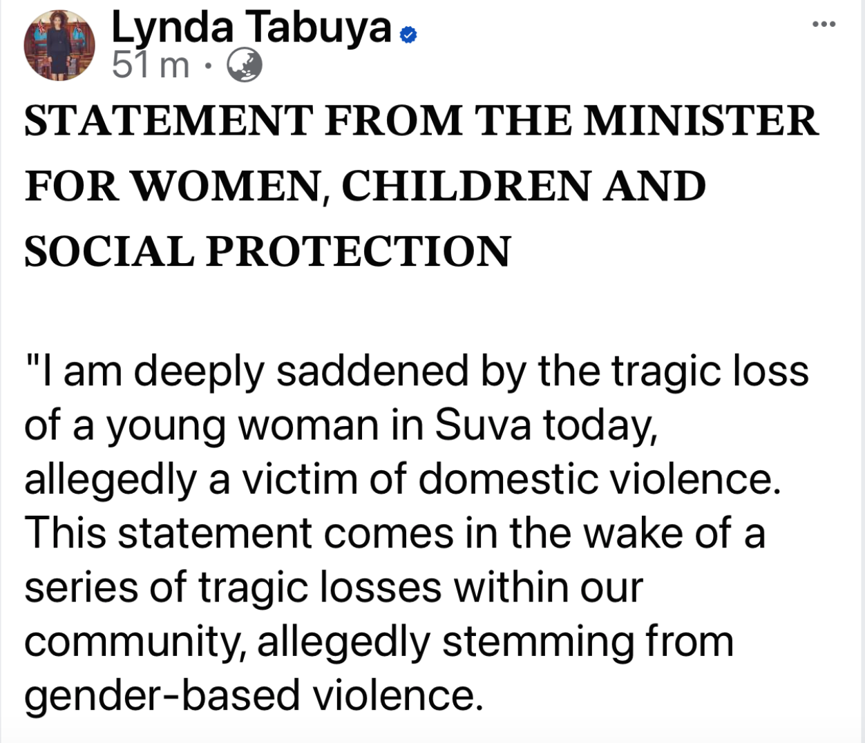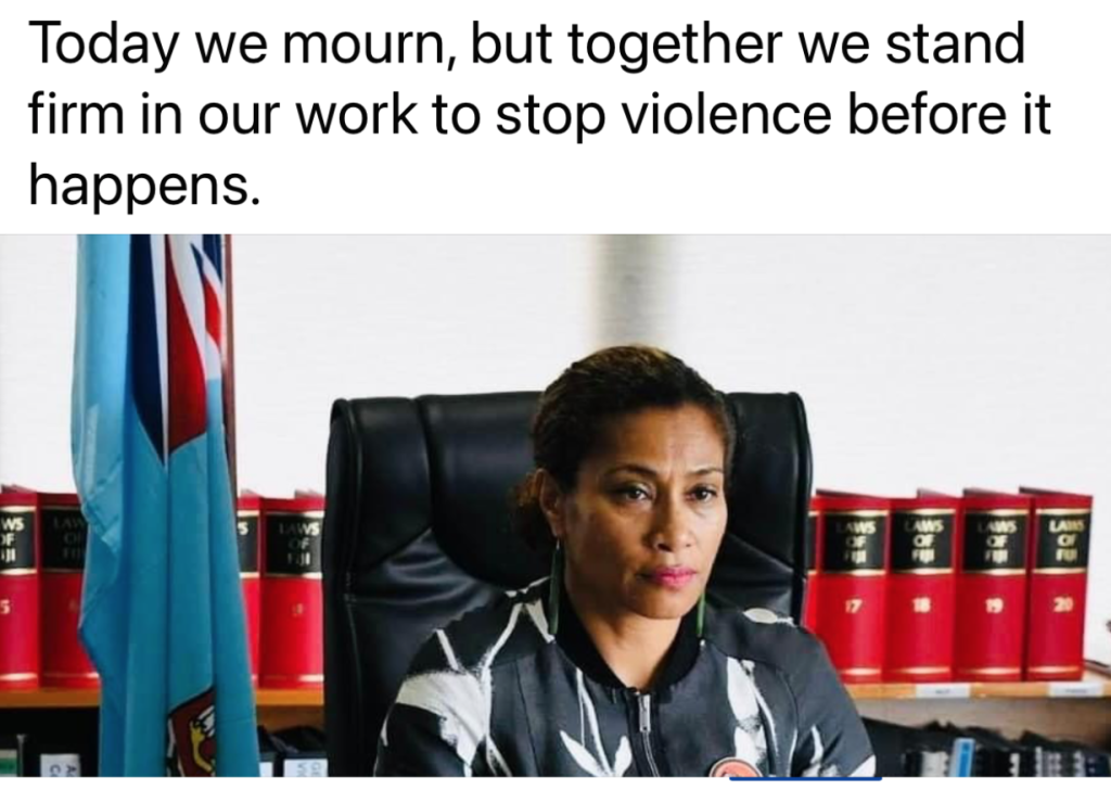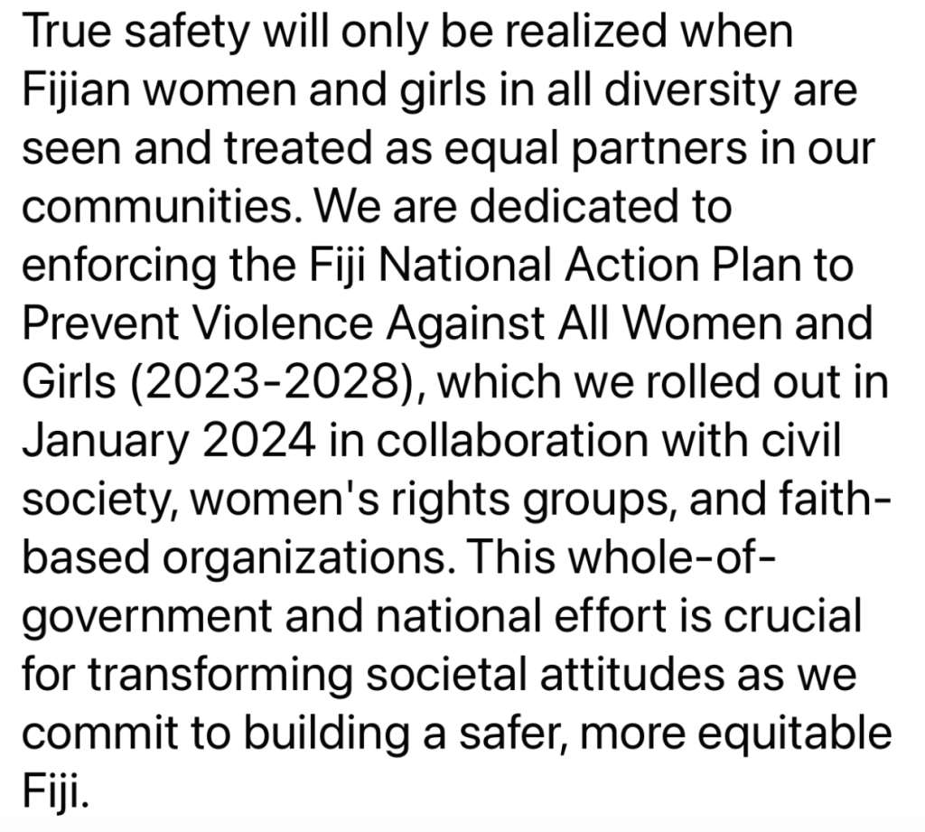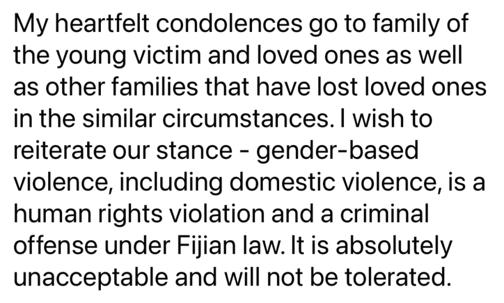 “It is with deep regret that we see the life of yet another Fijian woman extinguished by the hand of her partner. We need to stop these events before they happen, but that will be near impossible now that we have the endorsement of the President and Coalition government of a Minister for Education who anally raped and attacked his former wife, slept with me in a room on the same floor as his self-serving wife funded by the Australian taxpayers, and whose children are in the care of their grandparents since his brutal attack on his former wife 10 years ago. Domestic violence and abusive control ruins lives and is the norm in 67% of households in Fiji. Due to the reinstatement of Aseri Radrodro today as Minister for Education, it is likely that many men will see that domestic violence is no obstacle to success. Therefore, my position as his lover and as Minister for Wimen us untenable and I hereby tender my resignation effective immediately.”
