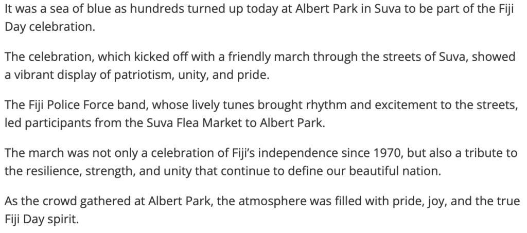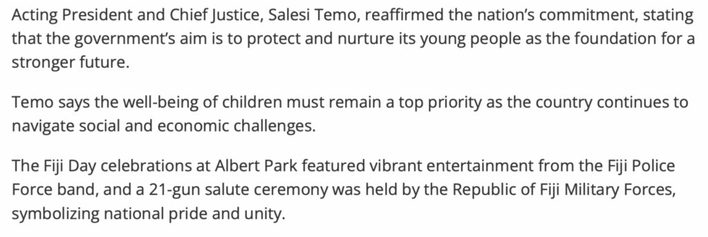 Rabuka’s banana republic. Noting to celebrate. Fiji has steadily going backwards since 1970. This has been accelerated under PAP. Now Fiji is in terminal decline.
