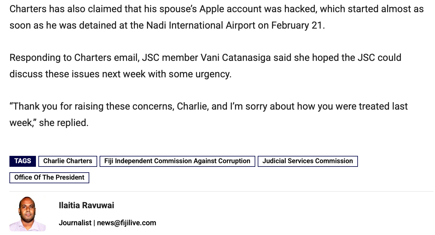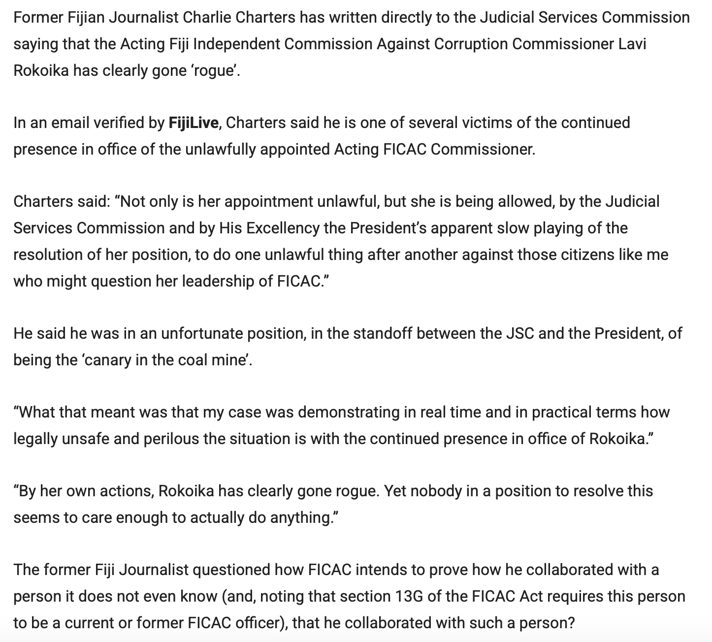 In an extraordinary development, Vani Catanasiga has taken it upon herself to personally respond to an equally extraordinary letter to the JSC by the so called “citizen journalist and publisher”, Charlie Charters, in which he launches a withering attack on the FICAC Acting Commissioner, Lavi Rokoika.
