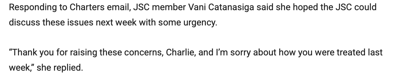 Now this. The trouble with Ms Vani is her brains are somewhere else other than in her head. By breaking protocol as member of the JSC and publicly apologising to that idiot and perennial attention seeker, Charlie Charters she just destroyed what little credibility the JSC had left.