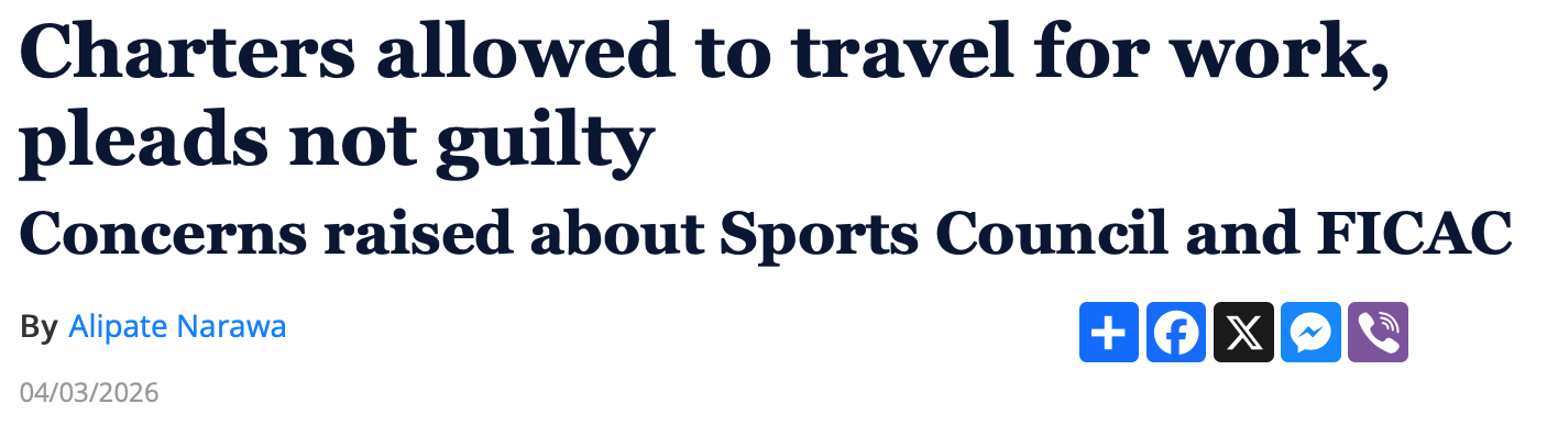 Charlie Charters is way out of line – in blatant contempt of the courts – in attacking Rokoika as having “gone rogue” as he awaits trial on a charge of aiding an abetting a unnamed FICAC whistleblower. Anyone else who did so would have the book thrown at them. But Charlie clearly doesn’t see himself bound by the laws that apply to mere mortals.