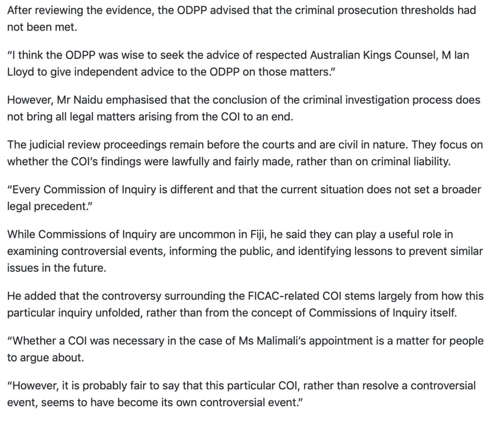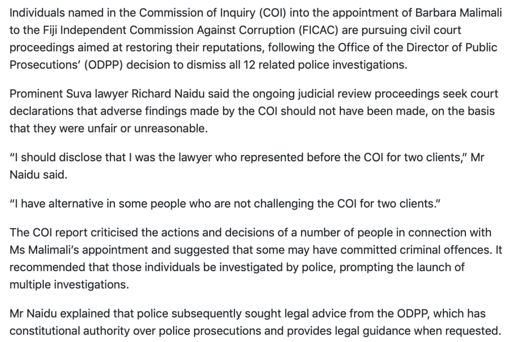 How? Because the Acting DPP, Nancy Tikoisuva, has decided not to prosecute any of the 12 police cases arising from the CoI. Richard Naidu appears to be casting that as giving those who received adverse mentions in the CoI Report a clean bill of health. And he wants the judges in the current judicial review actions to get Justice Ashton-Lewis’s findings set aside to also pronounce that they shouldn’t have been made in the first place on the basis that they were unfair or unreasonable to those whose reputations have suffered.