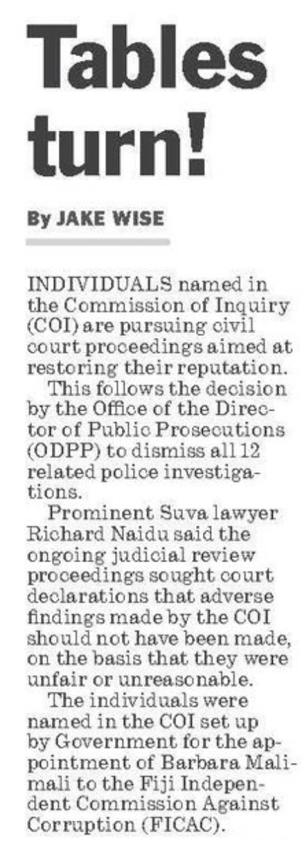 The Fiji Times – based on comments from lawyer Richard Naidu, who was a witness at the CoI and played a role in the events at FICAC that were examined in great detail by the Inquiry – proclaims today that the “Tables have been turned” – turned presumably on Justice David Ashton-Lewis and the entire exercise.
