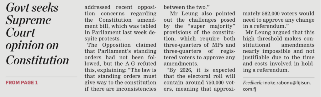 On what basis would the Supreme Court decide this? We have a hint of what the Attorney General thinks might be a winning argument from the following article in today’s Fiji Sun – that none of the previous constitutions in Fiji required a referendum to change them so that sets a legal precedent to ask: Why should this one?