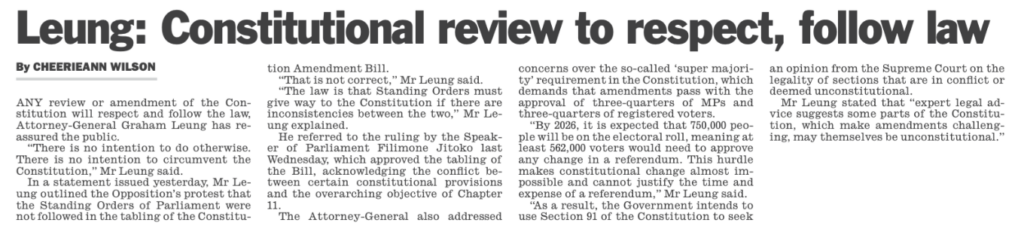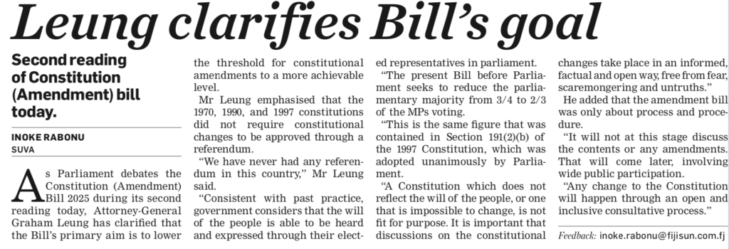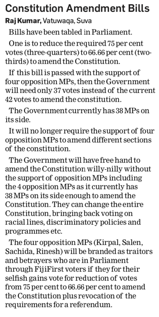 Today (Tuesday) will see a vote in the parliament on the second reading of Graham Leung’s Bill to reduce the current requirement for 75 per cent of MPs (three quarters) to approve changes to the Constitution to 67 per cent (two thirds). And all eyes are on the four ex-FijiFIrst MPs who voted with the government and its existing supporters to pass the first reading of the Bill last week.