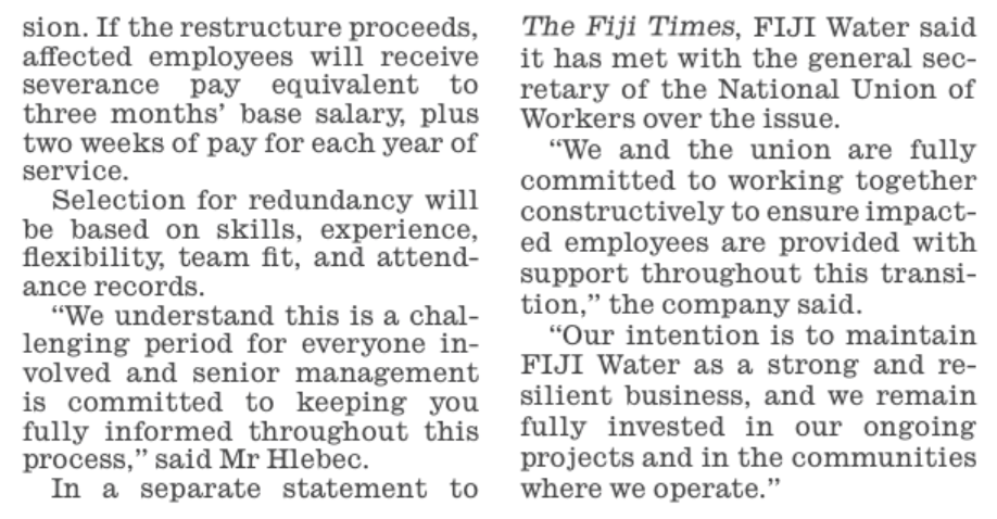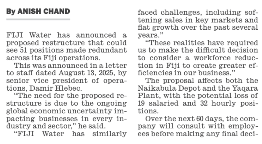 The headline is “Fiji Water plans restructure”, not “Fiji Water plans to retrench 51 workers”.