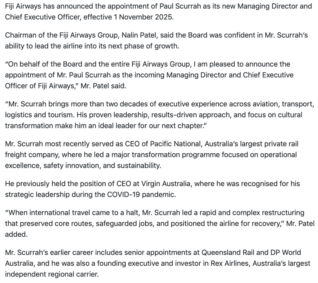 The one ray of sunshine in all the gloom this Tuesday morning is that the guardians of Fiji Airways haven’t fallen for the concerted campaign for a local to be given charge of easily our most precious national asset. We welcome the new CEO of Fiji Airways – Paul Scurrah, the former head of Virgin Australia – and wish him clear skies as he builds on the great work of the departing Andre Viljoen for the past decade.
