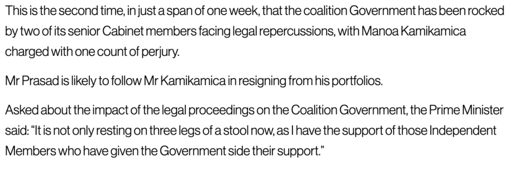 1/ Arguably the government’s two most important ministers – the deputy prime ministers Biman Prasad and Manoa Kamikamica – have been charged with serious criminal offences that carry lengthy jail terms and have been forced to relinquish their portfolios and go to the backbench.