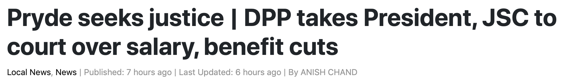As if the loss within a week of two of its most senior ministers, Manoa Kamikamica and Biman Prasad, to corruption charges isn’t enough, the same front page carries the news that the substantive DPP, Christopher Pryde, is seeking a judicial review of the decision by the Chief Justice, Salesi Temo, to sever his salary in the ongoing standoff between Pryde and the state which merely adds to the government’s woes.