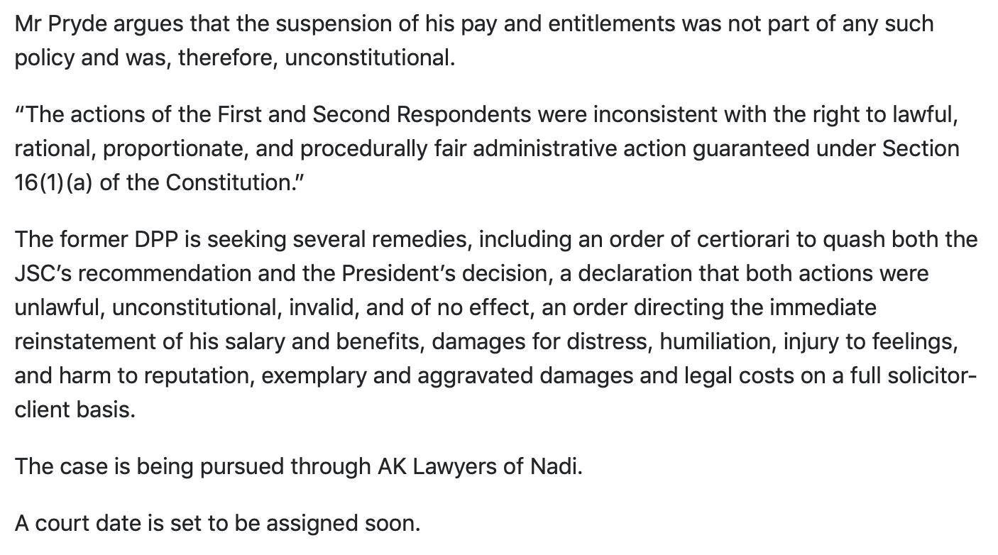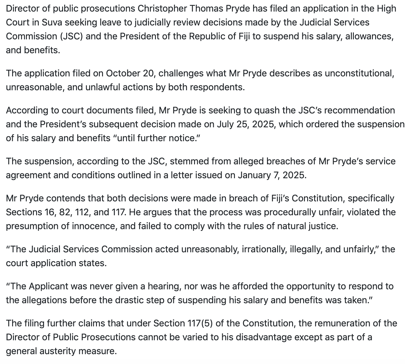 2/ Nothing is going to prevent these trials from going ahead, including Wylie Clarke‘s mooted application for a stay of prosecution in the case of Manoa Kamikamica, which we can expect to be replicated in the case of Biman Prasad. Why? Because the prosecutions haven’t been brought by the Acting FICAC Commissioner, Lavi Rokoika – whose appointment is being challenged- but by FICAC itself. And any intervention to shoot the corruption watchdog would be a crude and outrageous attempt to pervert the course of justice. When the wheels of justice start turning, they turn. And that’s it.