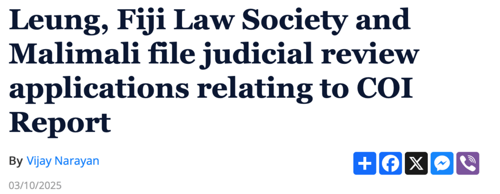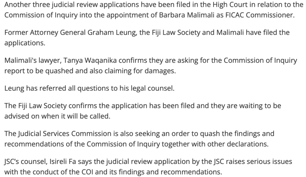 “Today the Fiji Law Society filed their application for a judicial review of the COI Report and tomorrow Graham Leung’s will be filed just inside the notional deadline of October 1. So that means four JRs on the COI Report plus Malimali’s JR of the process leading up to her sacking.”