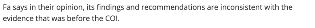Here’s the relevant extract from the CoI Report, referring to Wylie Clarke and Laurel Vaurasi as being part of an alleged “conspiracy to obstruct or pervert the course of justice”.