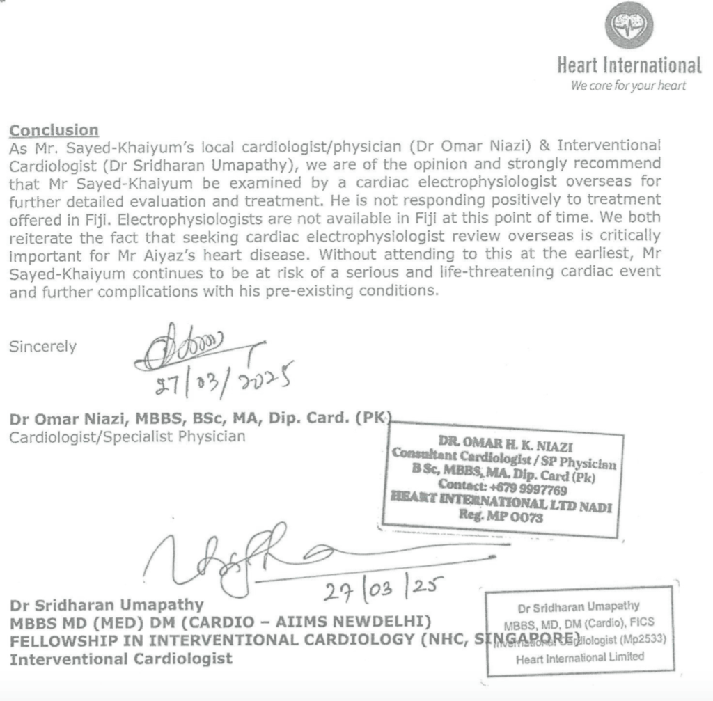 There’s only one problem with this and it is as glaring as it gets. According to other experts, Dr Sanjeev Khulbey is a cardiothoracic surgeon who performs heart operations such as inserting stents and mechanical valves. But he is NOT a cardiologist with the specialised expertise Aiyaz Sayed-Khaiyum requires – treatment for his irregular heart rhythm that can ONLY BE OBTAINED OVERSEAS because the capability DOESN’T EXIST in Fiji. It’s all in the documents we published on Wednesday.