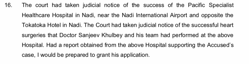 Salesi Temo raised eyebrows in the previous hearing of Aiyaz Sayed-Khaiyum’s application when he played doctor and advised him to seek treatment at Nadi’s Heart International – Fiji’s only specialised cardiac hospital – which he praised as having a good record of treating cardiac complaints.