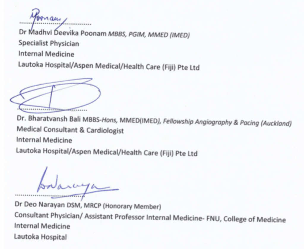 As Grubsheet revealed on Wednesday, this recommendation was supported by the following three specialists at the Aspen Hospital in Lautoka, where Aiyaz Sayed-Khaiyum has been treated for a stroke and ongoing cardiac problems.