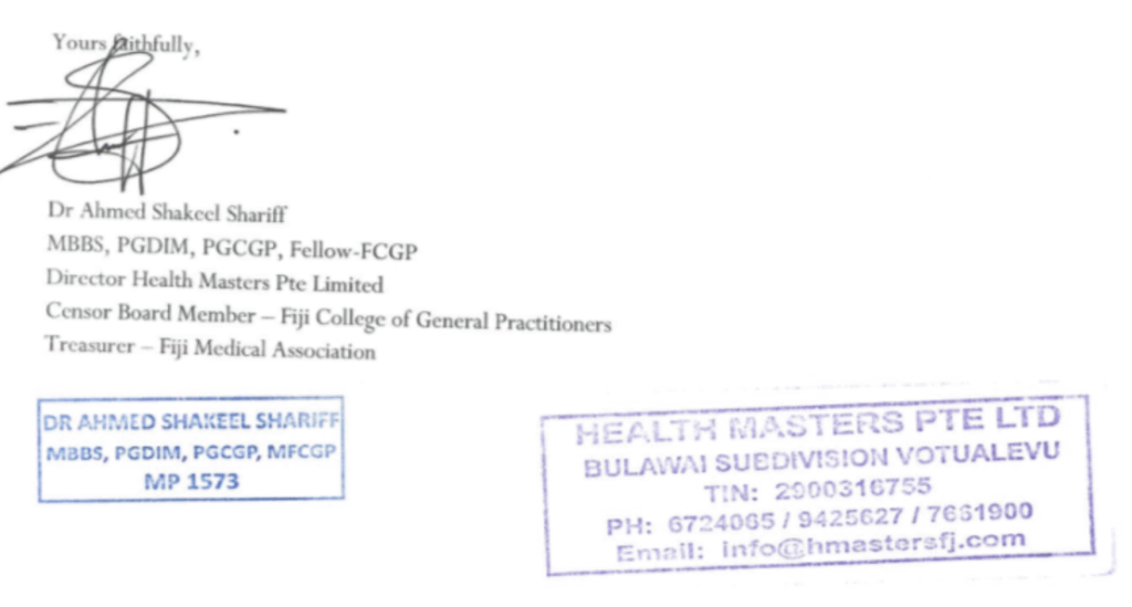 And from the following specialist from the HealthMasters Medical Centre in Nadi, which has long been treating Aiyaz Sayed Khaiyum and members of his family.