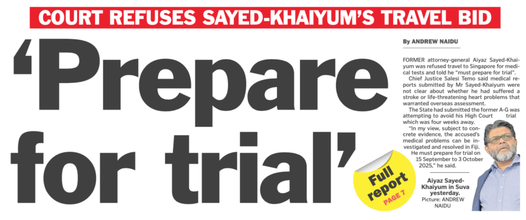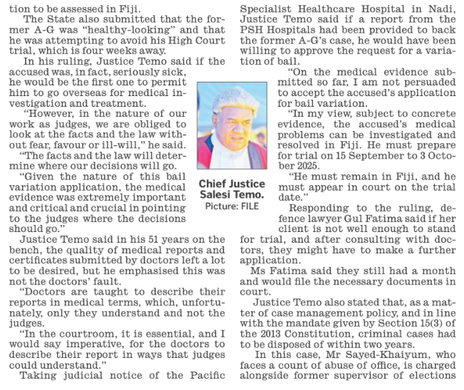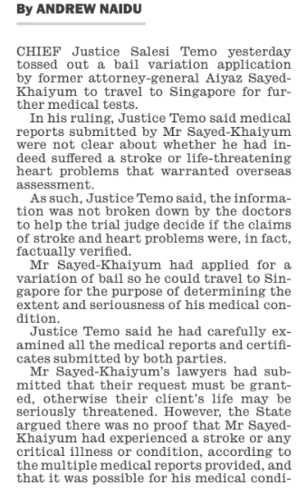 Incredibly, they “leave a lot to be desired” because Salesi Temo says he had trouble understanding them. They are totally unambiguous in saying that Aiyaz Sayed-Khaiyum requires urgent treatment overseas. But that’s not good enough for “Dr Temo”, who occupies the top job in Fiji’s judiciary but can’t comprehend documents in front of him that explain the bleeding obvious.