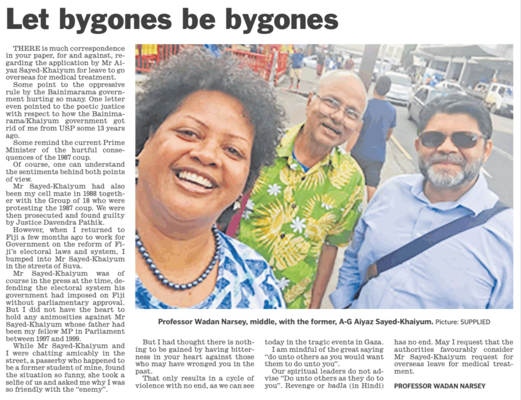 I salute Professor Wadan Narsey for saying in Sunday’s Weekend Times that ASK should be allowed to go. At least there is someone associated with the new order who has respect for humanity and the welfare of a fellow human being, his wife and three young children. As for the rest of the ugly and vengeful mob, karma is coming for you, not him. Of that you can be sure.