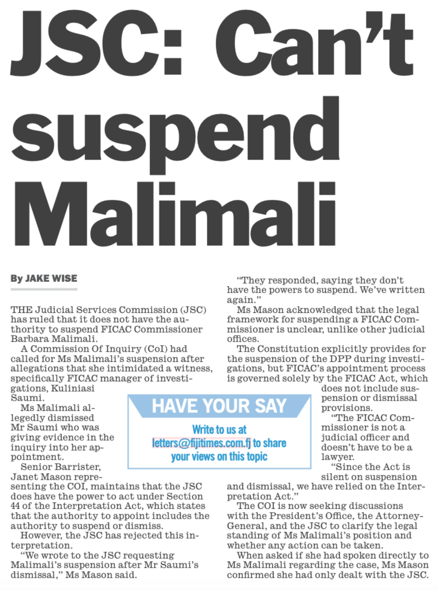 Salesi Temo says he doesn’t have the power to remove Barbara Malimali because the Constitution doesn’t have a specific provision for removing a FICAC Commissioner. Not so, says Justice Ashton- Lewis. It does have a specific provision for appointing a FICAC Commissioner – the JSC. So the hand that giveth can also taketh away. The appointing body lawfully has the power of removal.