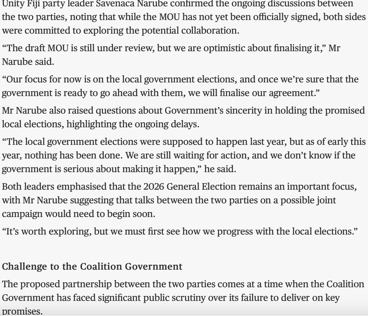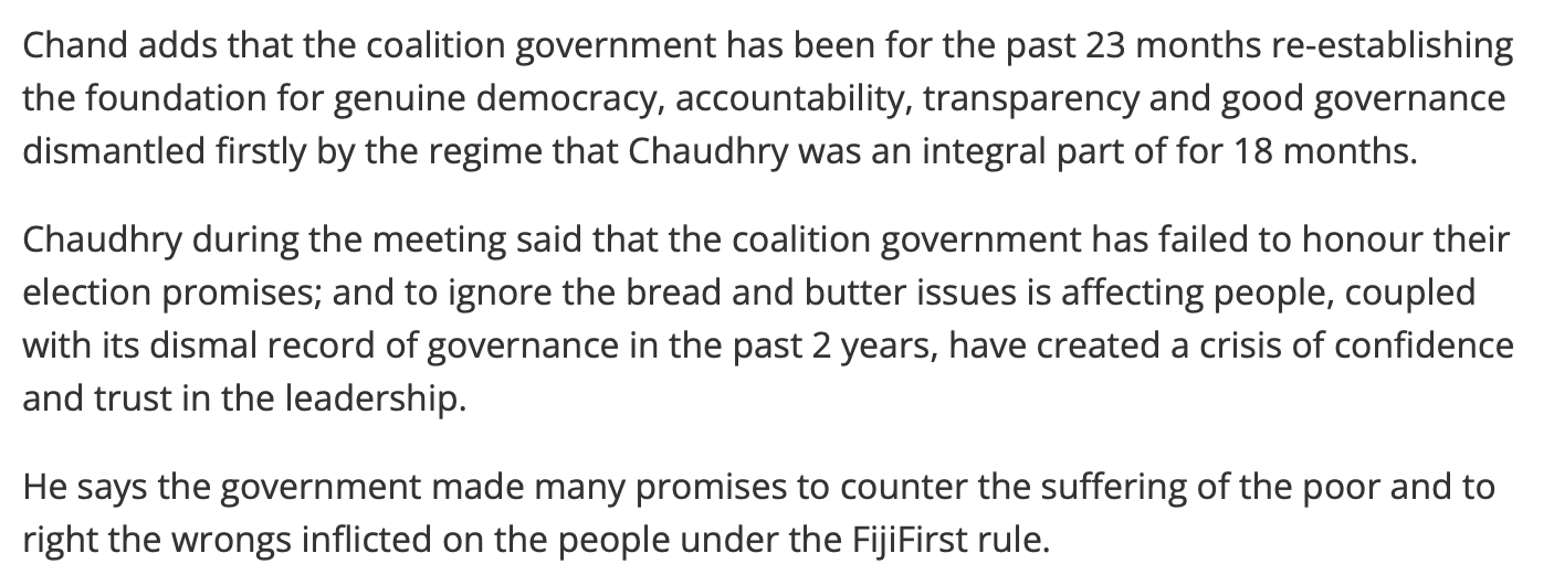 They are in power now by a mere one seat in parliament with the help of SODELPA and NFP.