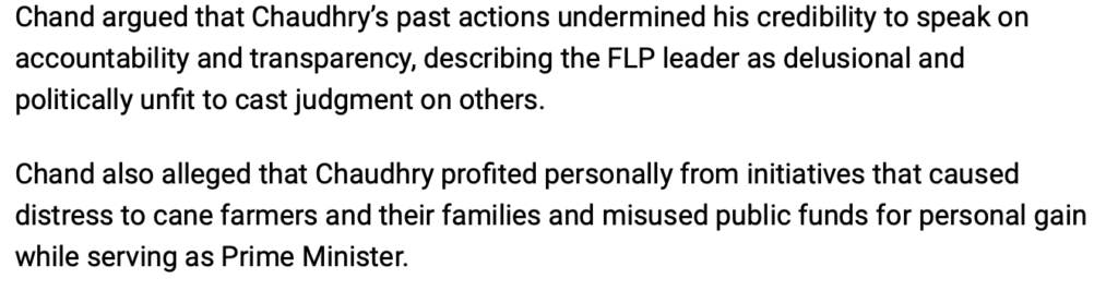 At the end of the day, the sole reason that Chaudhry is so vehemently campaigning against this government and NFP in particular is that he still carries the hatred and jealousy of NFP and Jai Ram Reddy that he has held since the 1990’s. Of course, he also wants to be in government to allow his son back in the country and recoup the million dollars that he was forced to give up. But Chaudhry hates the fact that the NFP is in government while he is wandering the political wilderness that he once banished NFP to in 1999 and the subsequent two elections. I don’t know whether Chaudhry is choosing to ignore or has forgotten the fact that even when Labour was at its peak after forming government in 1999 NFP had decimated it at the local elections level. I don’t know what a Labour Party which is a shell of its former self can muster up. Maybe it can replicate the efforts of NFP in the 2000’s at local government elections and sweep the board.