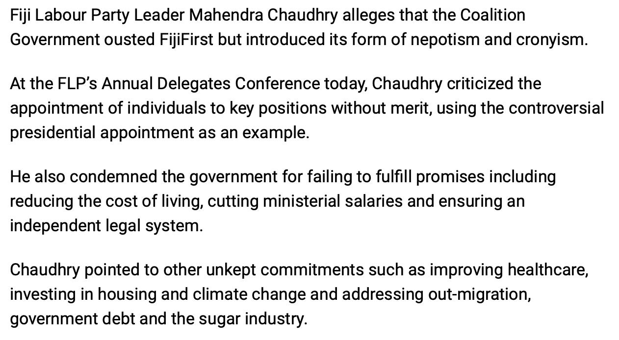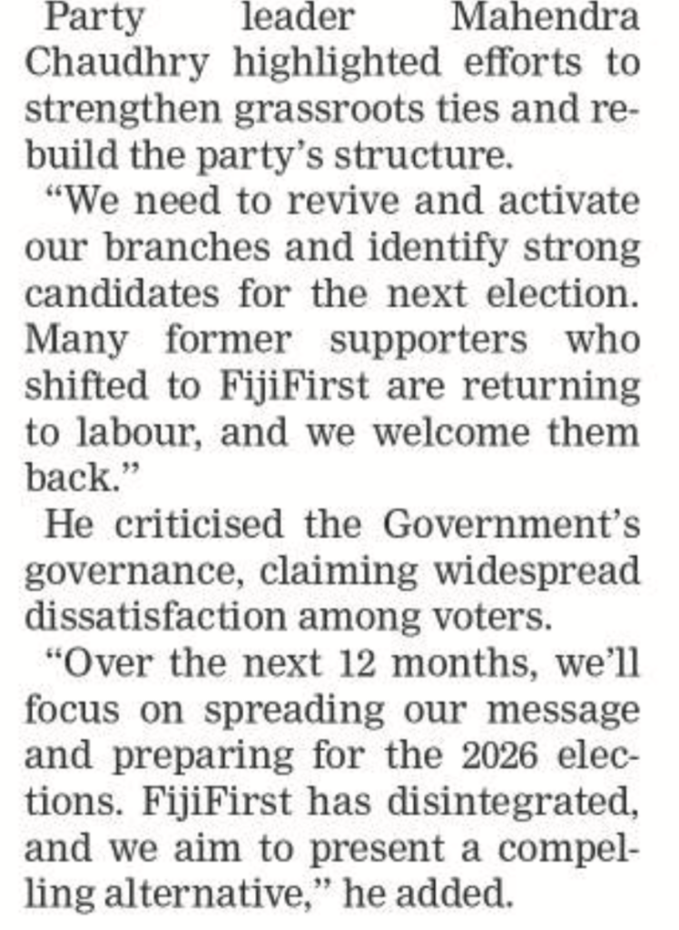If the Coalition parties – and especially the People’s Alliance – think two years out that they are going to coast to victory in 2026, then they have no idea of the groundswell of anger against them. They genuinely seem to think they are loved and respected when they are increasingly loathed and reviled. And so Mahendra Chaudhry is also spot on to have told his troops at the weekend that an opportunity exists for Labour to at least partly fill the void left by the collapse of FijiFirst.