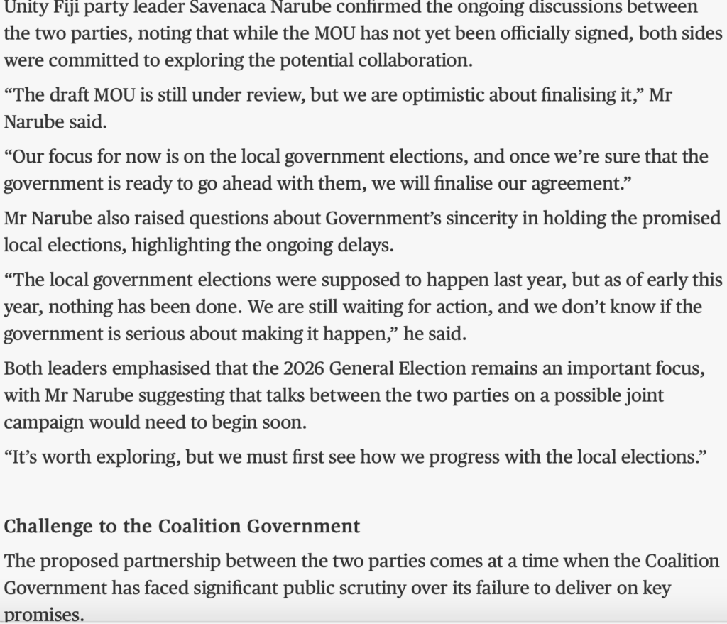 The announcement shows how bankrupt the political landscape in Fiji is. As GD pointed out neither gained the threshold at the last Election and are led by people pass their use by date.