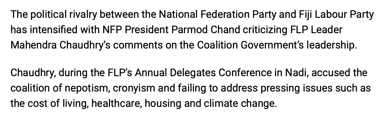Mahendra knows that with Fiji First gone and people hating Bee-man and NFP, and that there is hardly any opposition left, so it is now or never for him and FLP. So this is the perfect time for Mahendra to strike and act like a savior. If he doesn’t get into government by 2026, then by 2030 he will be too old to be a minister or even Prime Minister. He’ll be reaching 90 then. But if he does become PM in 2030 and serves till 2034, then he will be over the age of 90 and become the oldest Prime Minister Fiji has had. I actually want to see Mahendra becoming Prime Minister of Fiji and FLP forming government. I want to see what it will be like. What Mahendra, his boys and FLP can achieve? Will their government be any good? Or will it be another embarrassment like the coalition government now?