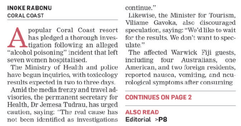 Where is the “media hysteria”? Naisa doesn’t tell us. But there is no evidence that Grubsheet has seen that could be described as hysteria. Any hysteria is at Gorrie Street over the potential impact of the pina colada poisonings on Fiji’s image. Which may have been dented if you like cocktails but is hardly on the line in any other sense.