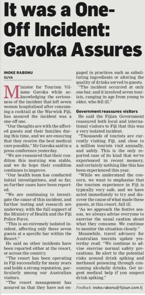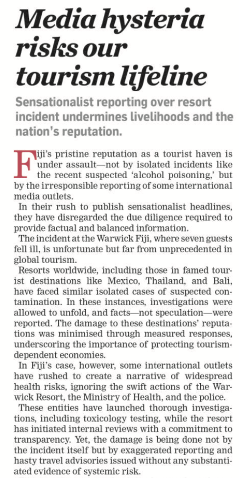 Of course, there will always be the odd media rogue in any such crisis who tries to take a stick to the story and beat it up – to sensationalise it. But overall, the media has covered this story responsibly and without triggering alarm that could permanently damage Fiji’s reputation. And it is how the Fijian government and Tourism Fiji handle this crisis that will ultimately determine the outcome.