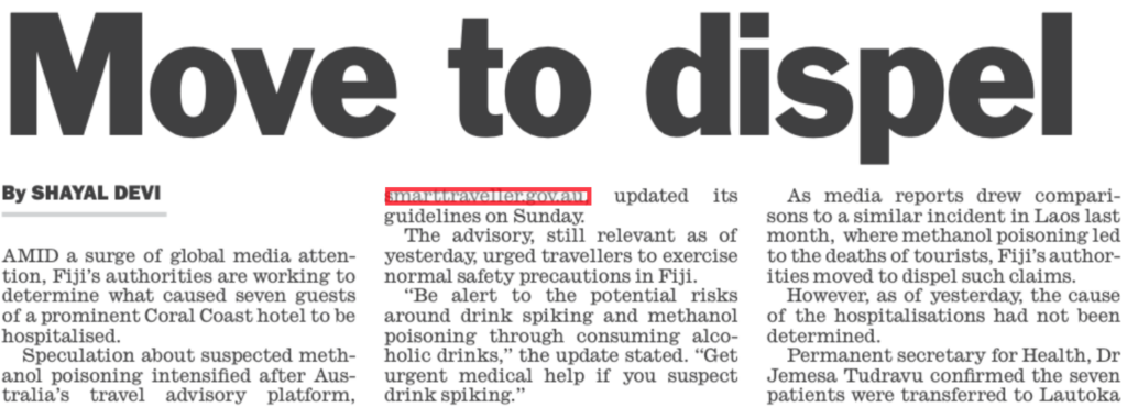 The Australian government’s decision to issue an alert about the potential for spiked drinks in Fiji has caused local upset because it raised the possibility that this is not a “one off” – that guests at other Fijian resorts can’t trust what is in their glass. But the Australian authorities are just being responsible and especially after what happened in Laos. DFAT had no choice but to issue the warning to its citizens, either in Fiji or planning to do so, lest it be accused of negligence.