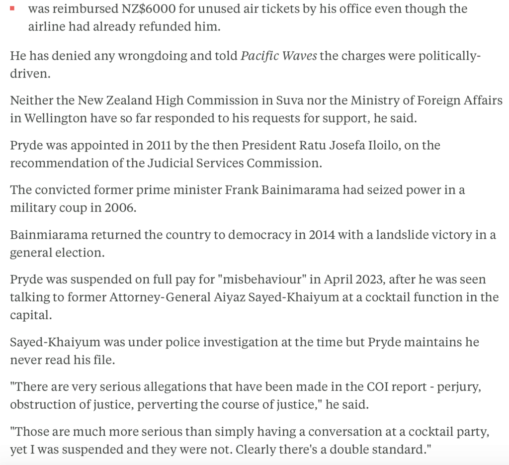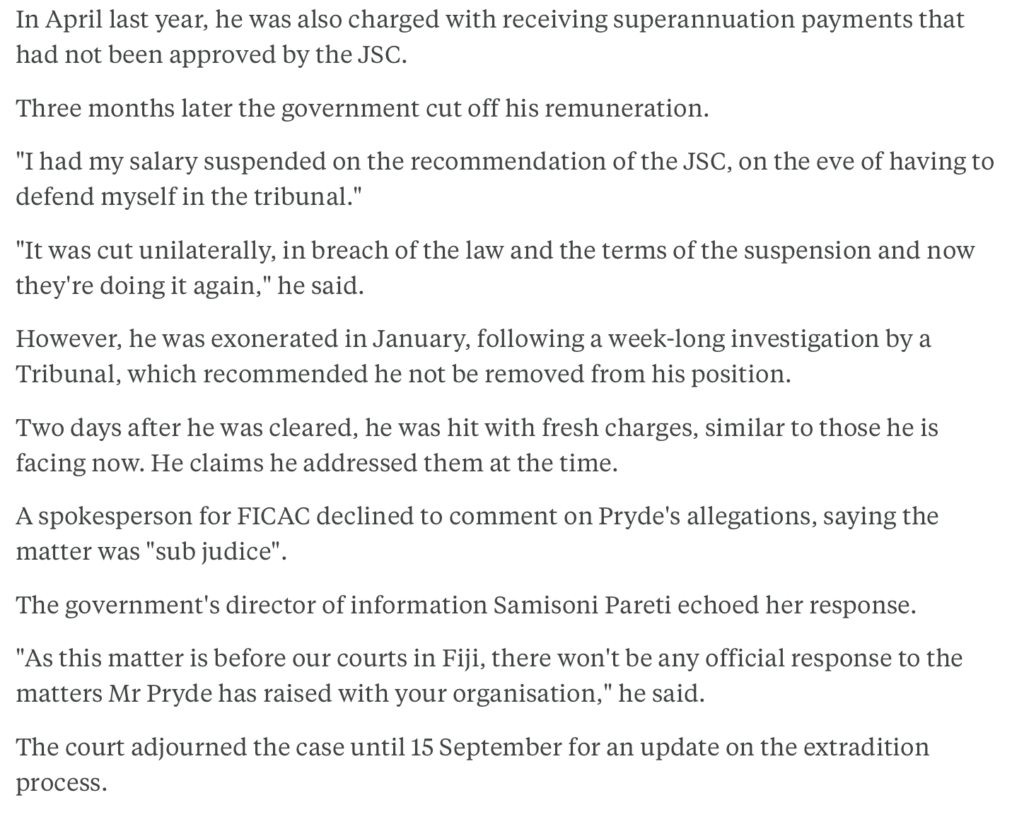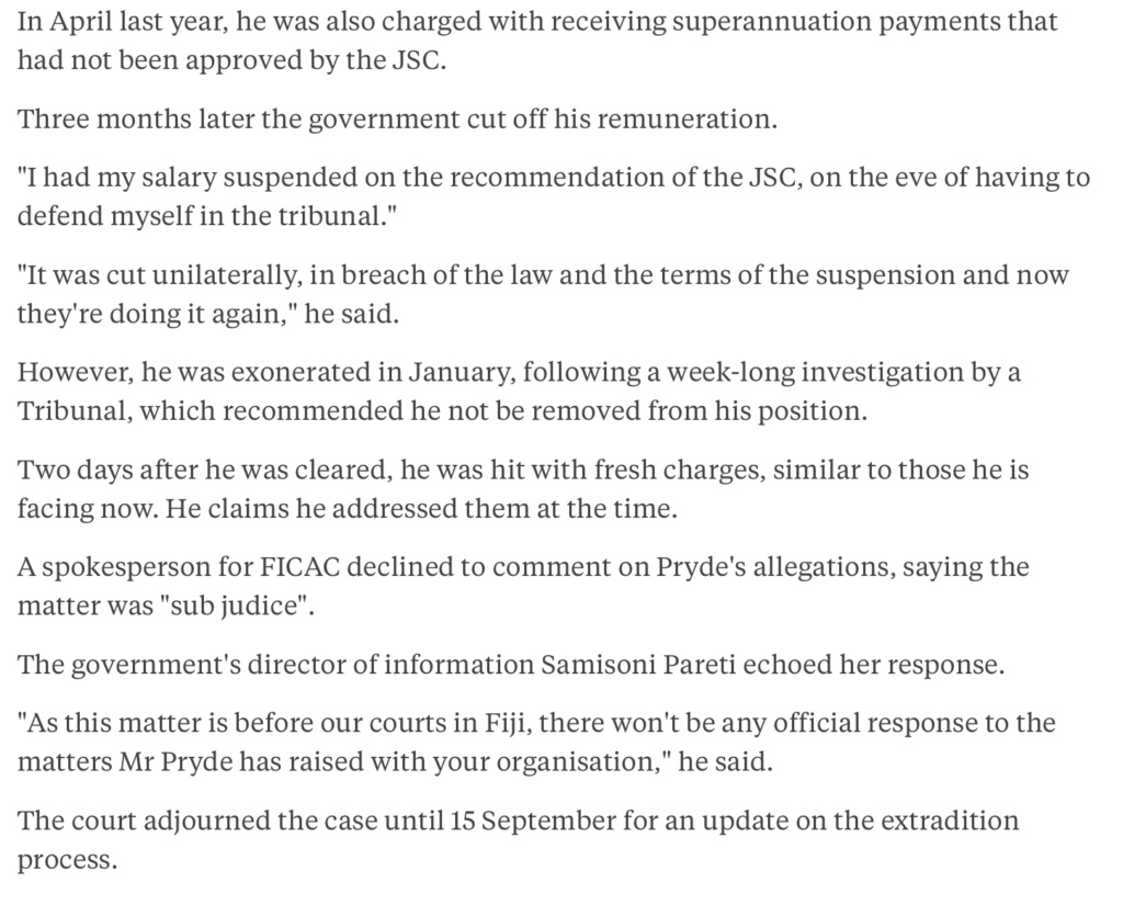 I suspect an ex gratia payment will eventually made by the Fijian govt to get rid of this mess that the Govt has created and Mr Pryde can then get on with his life.