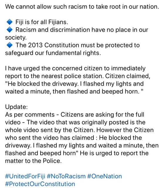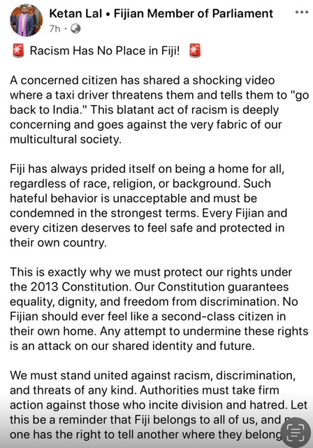 So yeah..racism is now normalized in everyday fiji life..its ok to be racist cos the leader of the racists is going to aid and abet hate speech. I recently for the first time got told to go to India by a taxi driver cos I tooted the horn after he cut in front of me illegally.