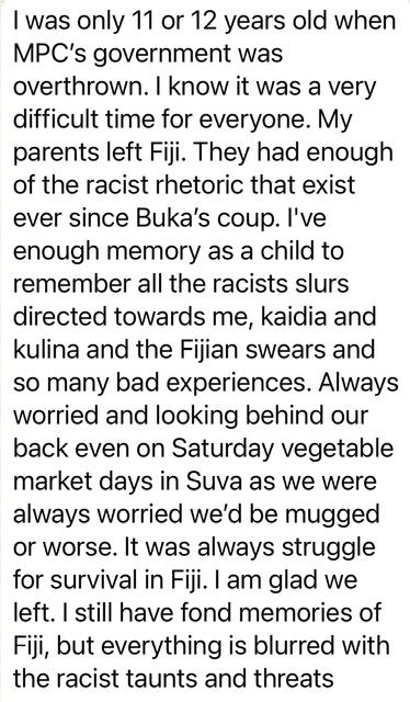 The saddest bit for me is I have finally realized that some of the very people I’ve worked, studied and shared my meals with all my life are racist. I do know there are many who are not and want to share a prosperous Fiji with everyone else but with the rise of ethonationalists, these peoples voices will be quashed.
