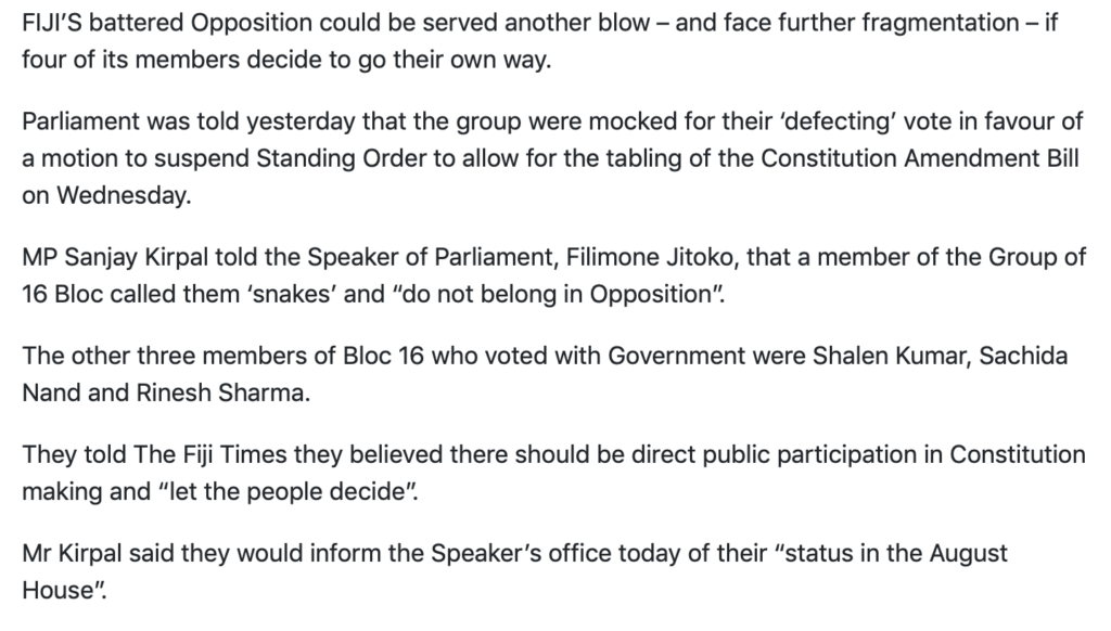 However much it upsets them, these individuals have invited the description of naga (snakes) and dogla (traitors). Because their mandate from the majority of Fijians who voted for FijiFirst at the last election was to uphold the principles of the 2013 Constitution, not work with its opponents to destroy them.