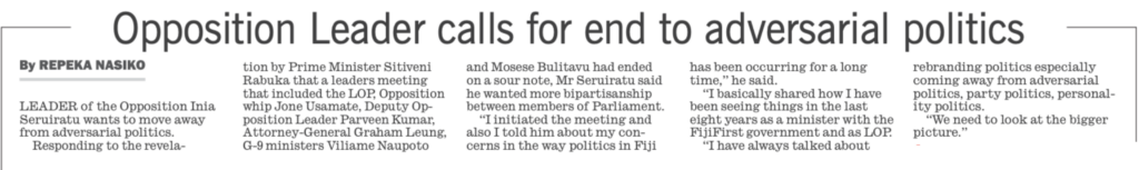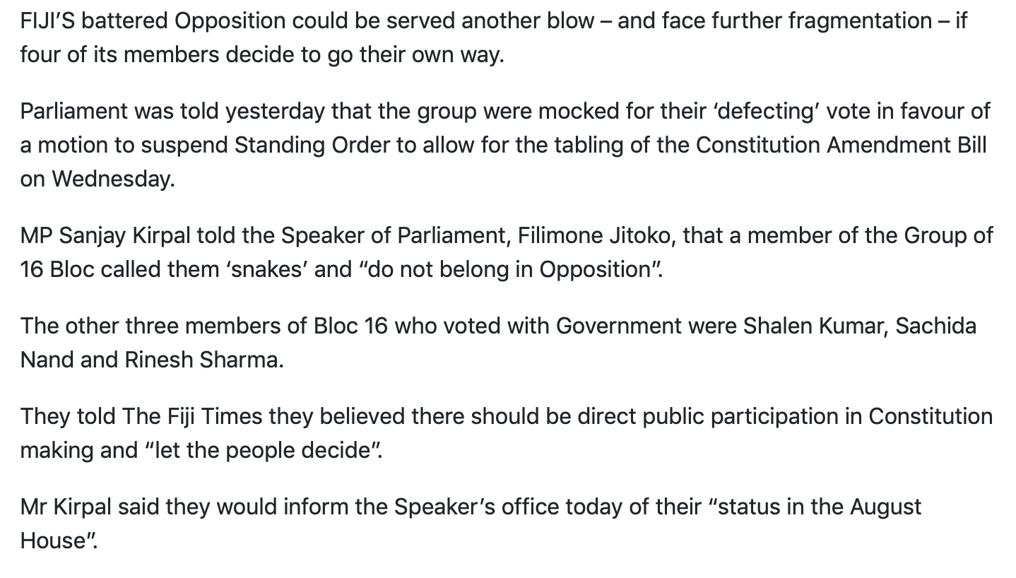 As soon as the opposition lost Bai and Kai leadership, they have been totally incompetent and ineffective. Rabuka always has been and will be about racist policies, constitution, ethnic cleansing, GCC, brain draining, corruption and personal wealth aided by laws that suited his agenda.