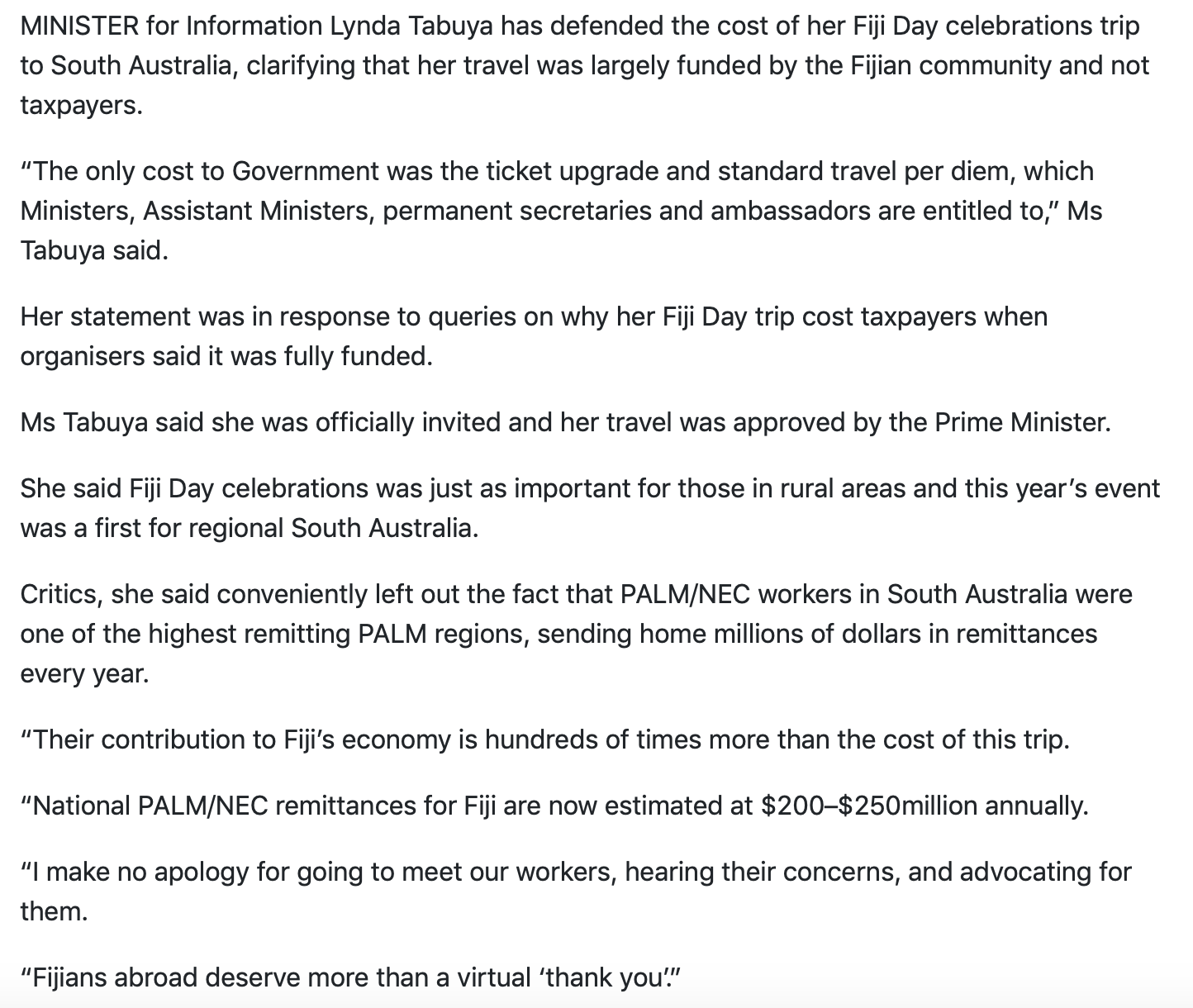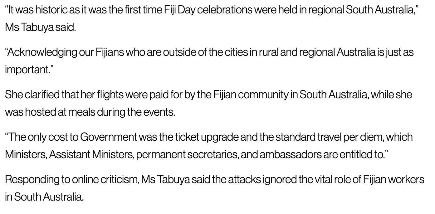 The failure of the Fijian media to appropriately apply the blowtorch to Lynda Tabuya over this scandal speaks volumes for the negligence and complicity of our senior journalists. The aforementioned stories in the two dailies are a justification for the South Australia visit as a whole, not the issue of the Minister double-dipping on her expenses.