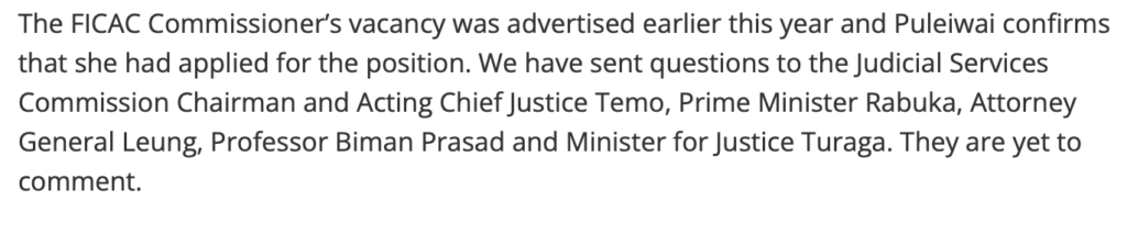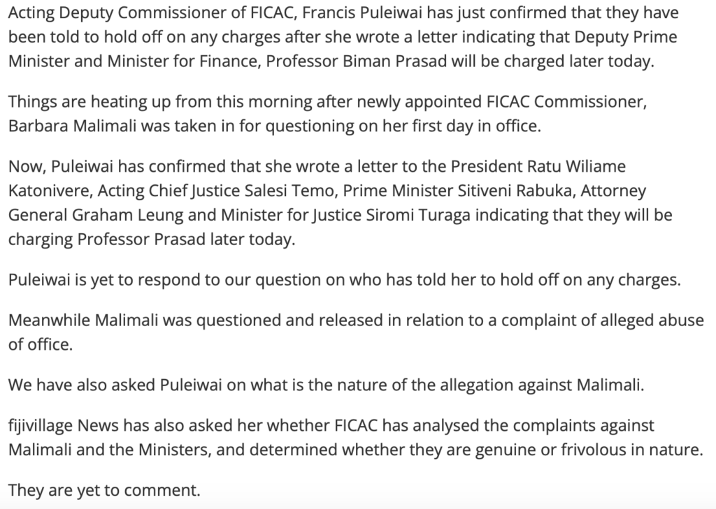And who told the FICAC Deputy Commissioner to “hold off” on charging Biman Prasad? Was it her new boss, Barbara Malimali, or the Attorney General, Graham Leung? Or the head of the JSC, The Acting Chief Justice Salesi Temo?