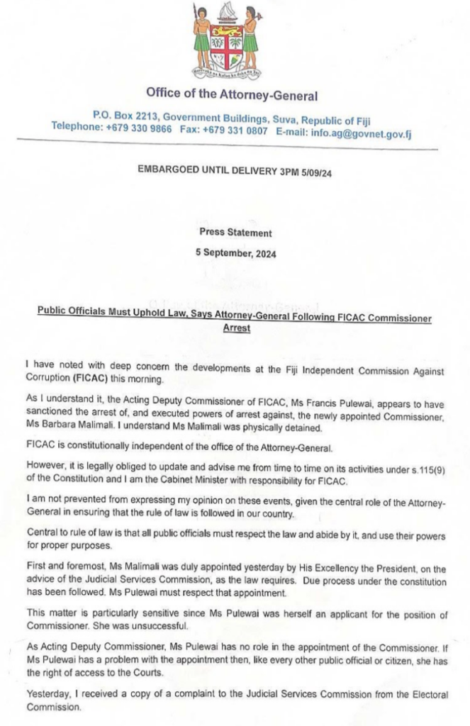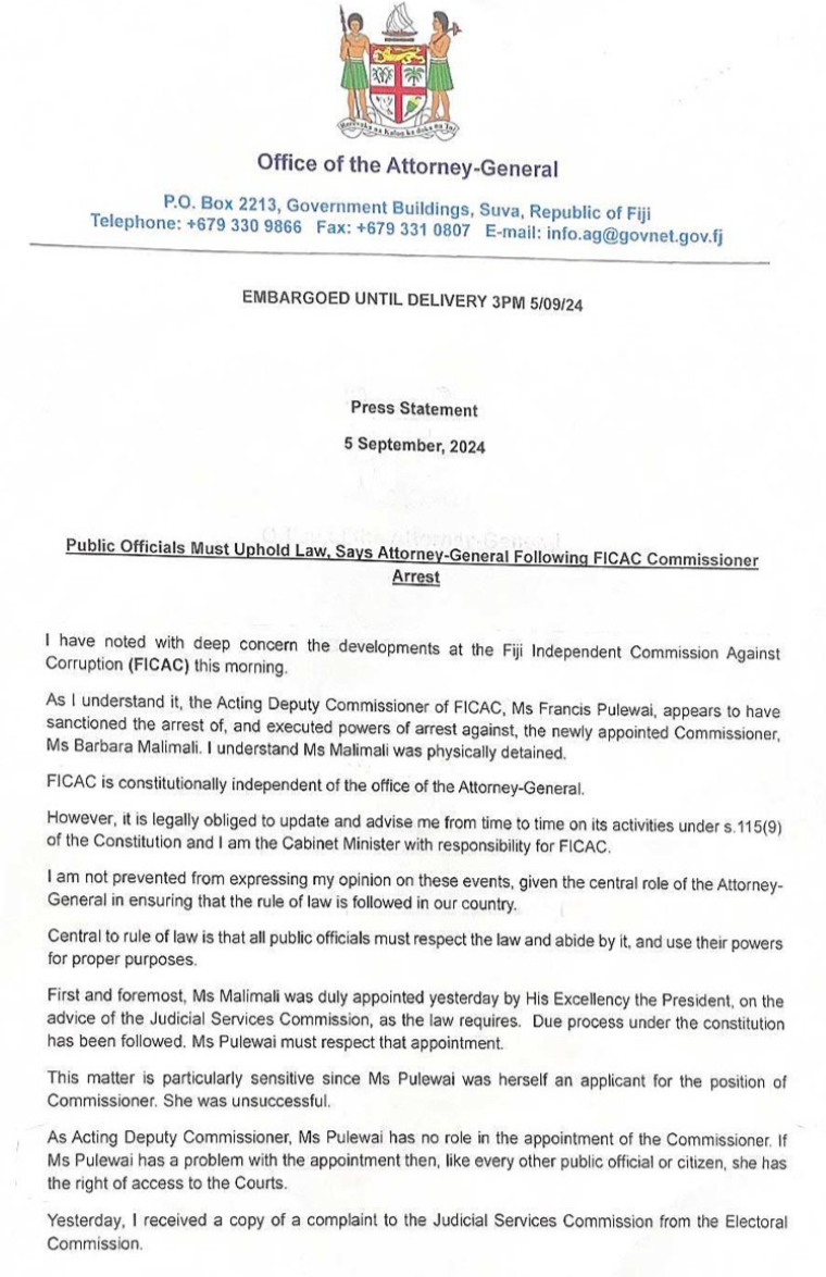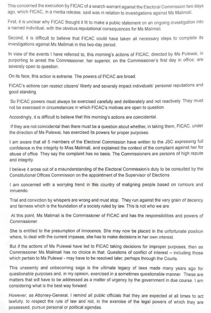 So why are they interfering and holding press conferences. Who is the AG to say there is no basis regarding the complaints against Malimali. Is he suddenly the self-appointed judge, the jury and the executioner? Is he making up laws as he goes. Is he twisting the FICAC Act on the go to suit his purpose? Is he going to interfere in any other matters with FICAC or with the courts. He is not even an elected official.