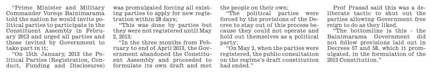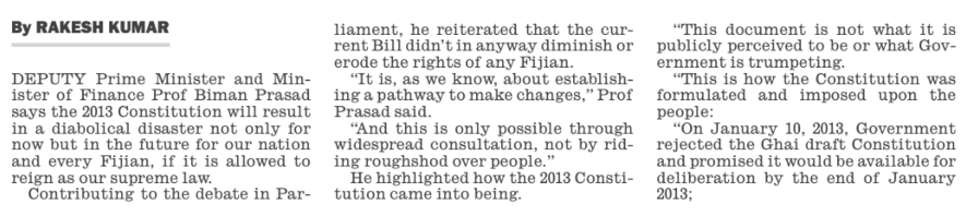 GD – you, in your professional capacity, saw a number of things during your tenure with the FFP government. The former AG has is on record stating that the 2013 constitution was formulated through a detailed series of consultations throughout Fiji with people in Fiji. Can you (if allowed) elaborate on whether this happened and what the general feedback from the people was at the time?
