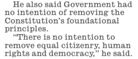 All that is now at risk. If the Coalition gets its way and the threshold in the parliament is reduced to the level of the numbers it already commands in the House and the need for a referendum of voters is abolished, no part of the Constitution is safe. At any time, a bill can be introduced and another clause can be altered. And because we know that Rabuka and his grisly gang are intent on re-imposing indigenous supremacy, the minorities are in clear and present danger if these changes go through.