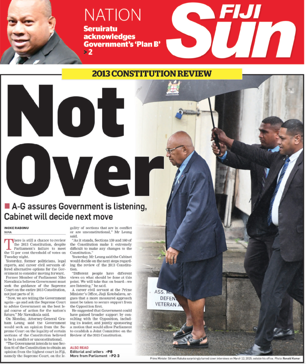 For Fiji to avoid repeating cycles of crisis, any constitutional reform must prioritize transparency and broad consensus. The government’s failure to secure a 75% majority for its bill – falling short by one vote – demonstrates the necessity of cross-party collaboration [1][4]. As Attorney-General Graham Leung noted, the constitution must be a “living covenant” reflecting evolving public will [7], but this requires mechanisms ensuring amendments serve national – not partisan – interests. Lessons from the Deuba Accord of the 1990s, which emphasized inclusive dialogue during constitutional reviews [5], remain relevant today.
