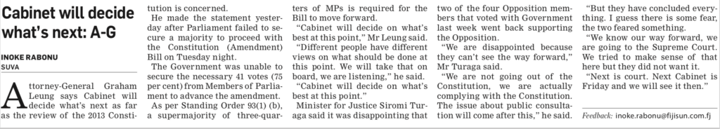 [1] https://maitvfiji.com/it-ends-here-fiji-speaker-says-after-parliament-voted-against-bill-to-amend-fiji-constitution/