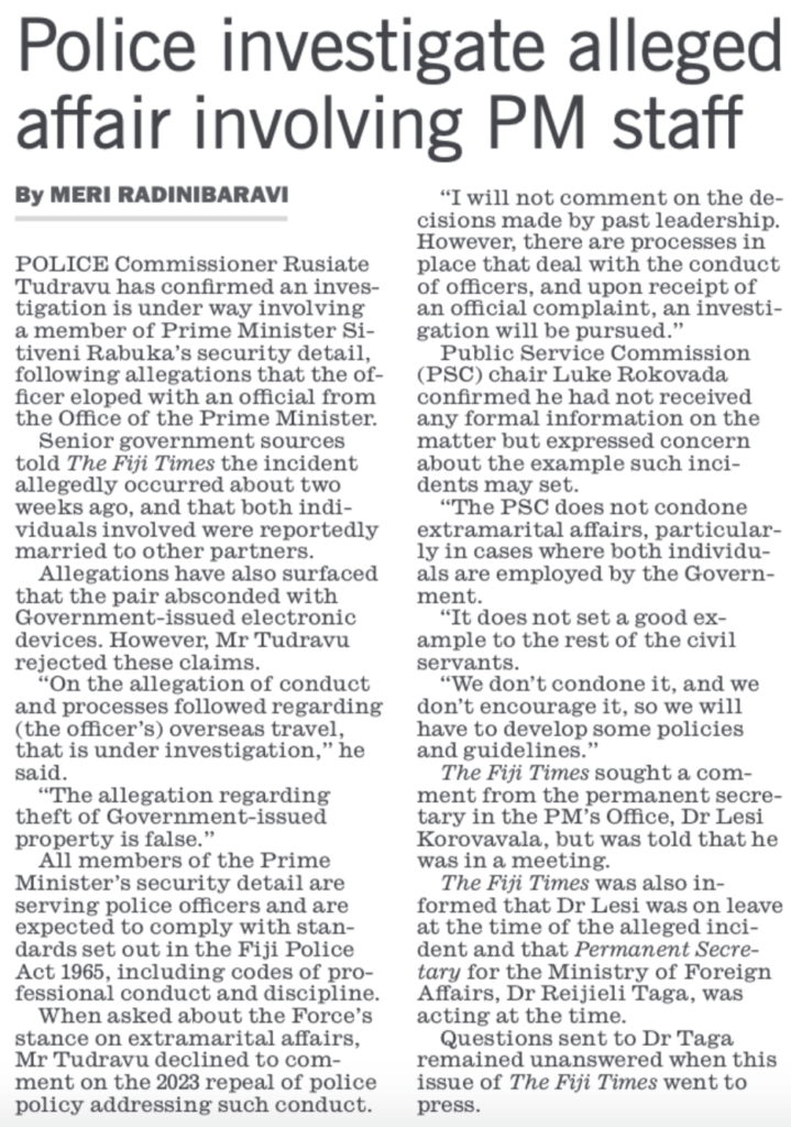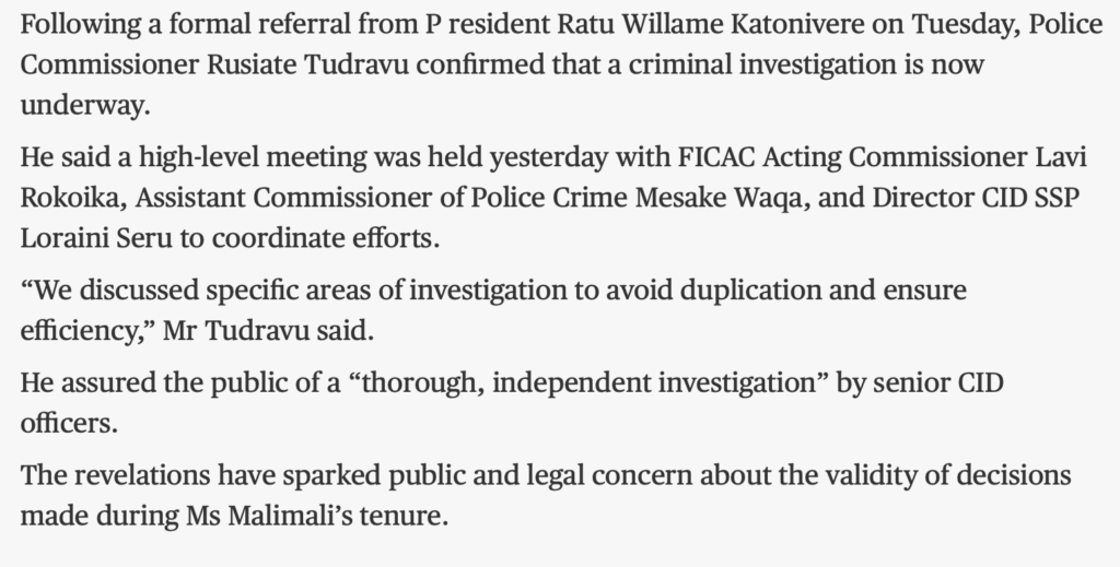 Sitiveni Rabuka has flip-flopped between promising that the report would be made public, withdrawing that undertaking, making it again, and is still unable to make a decision what to do. In the meantime, multiple copies have been distributed across government and the offices of state – to FICAC, the Police, the RFMF and reportedly even to some of those named in the Report in a leak from the President’s office.